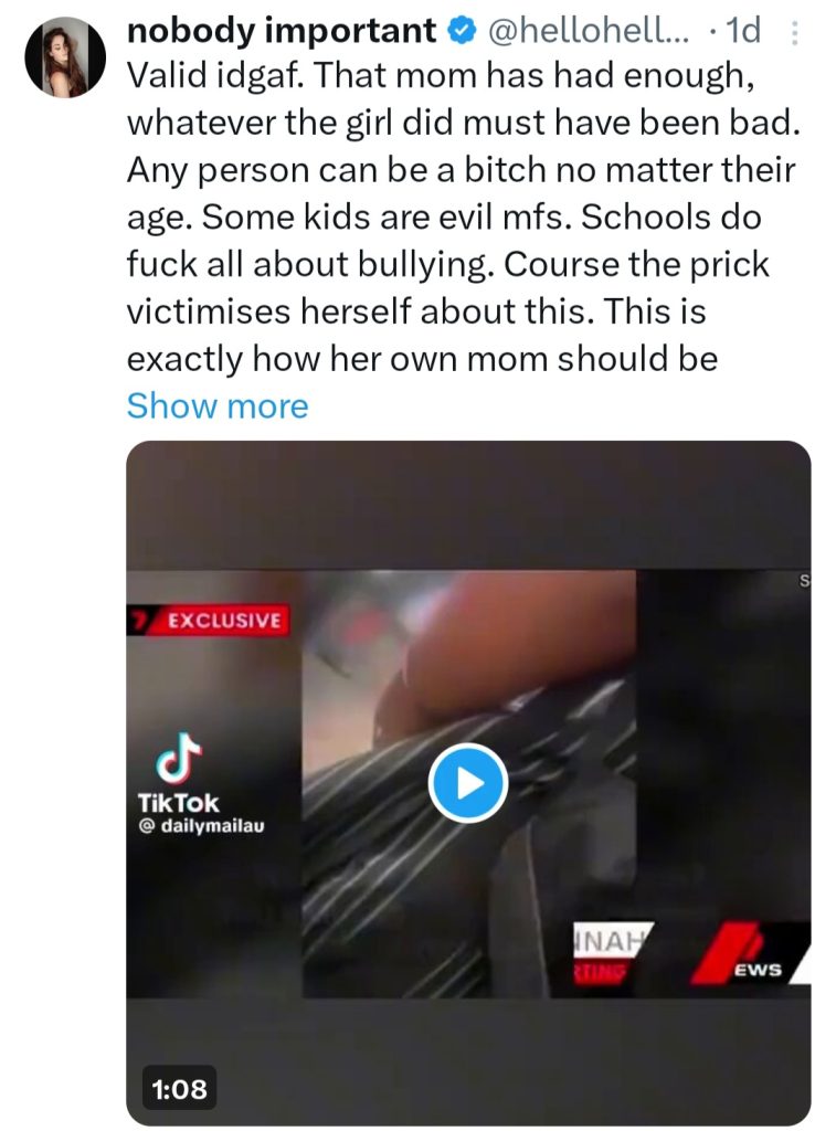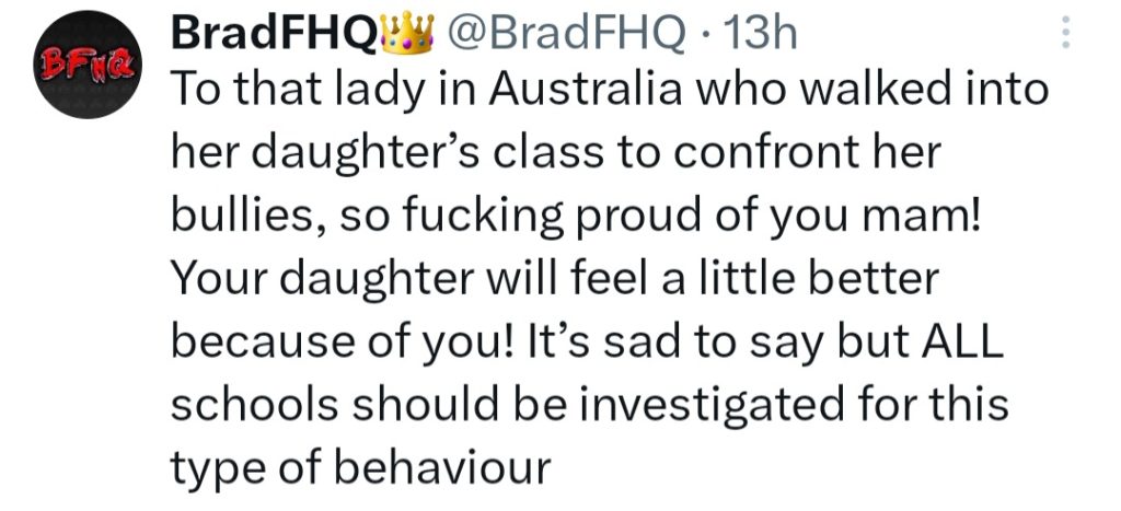 She stated that her daughter came back from school, devastated, and crying after another student told her to “go and h@ng herself” and other students threw her rocks. She said the pain and anguish in her daughter’s voice made her want to protect her child, so she went to the school to take matters into her own hands.