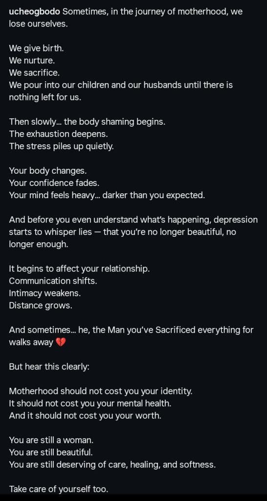“Motherhood should not cost you your identity” – Uche Ogbodo urges moms to care for themselves