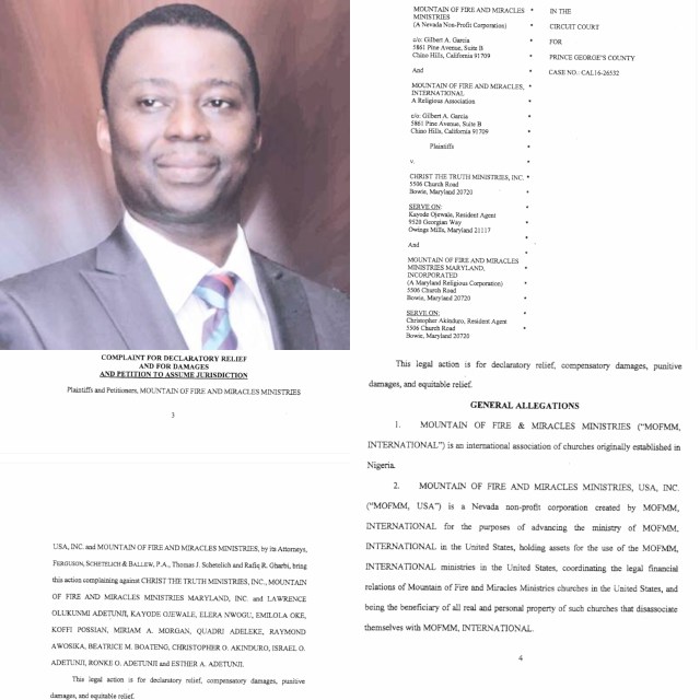 MFM is seeking declaratory judgment and damages against Pastors Lawrence Adetunji, Ronke Adetunji, and 11 former members of MFM, Bowie, Maryland.