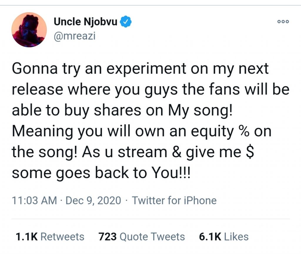 The 29-year-old in a tweet said he was going to try an experiment where his fans will own equity on his yet-to-be-released song as they stream on Wednesday.