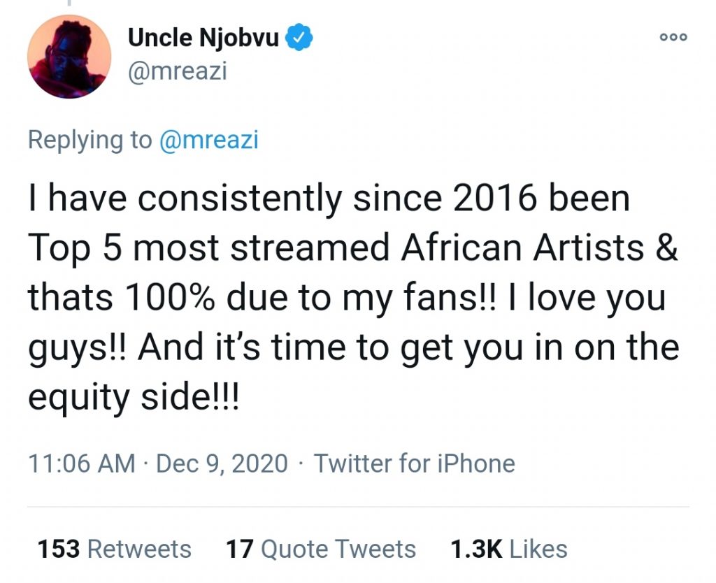 In another tweet he said due to his fans, he has been top five most streamed African artists since 2016.