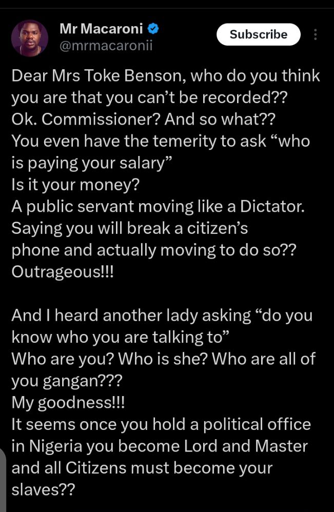 Mr Macaroni, in a series of tweets, has berated the commissioner for her attitude, stating that Nigeria is not in a dictatorship.