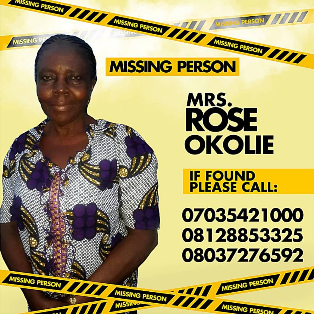 Her name is Mrs Rose OkolieShe left her daughter’s house on the 28th November 2020 at about 4pm and yet to return.