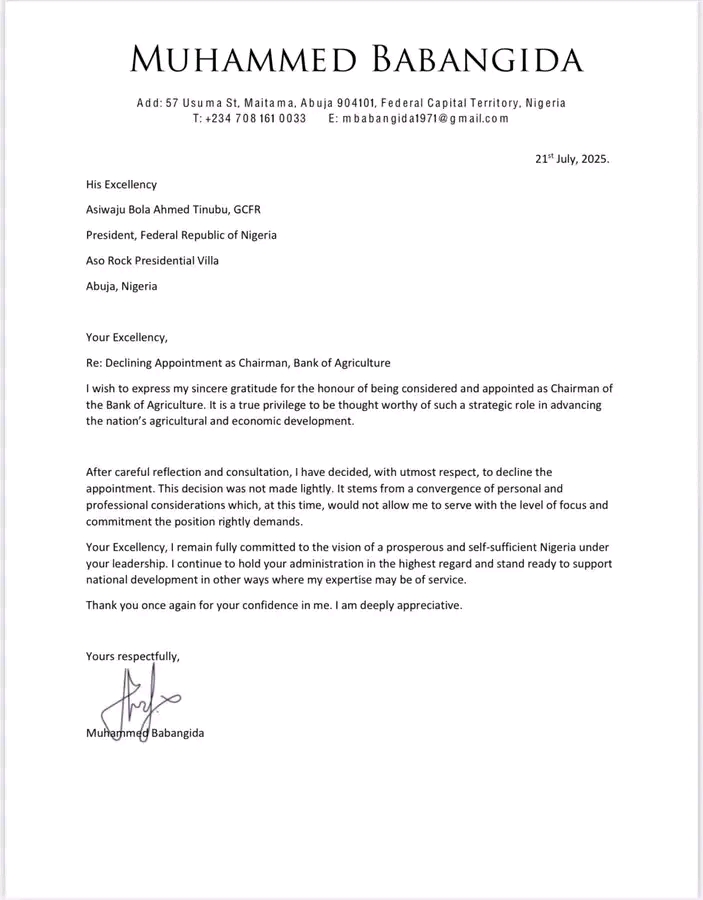 According to a statement dated July 21, 2025, Babangida cited personal and professional reasons for turning down the offer.