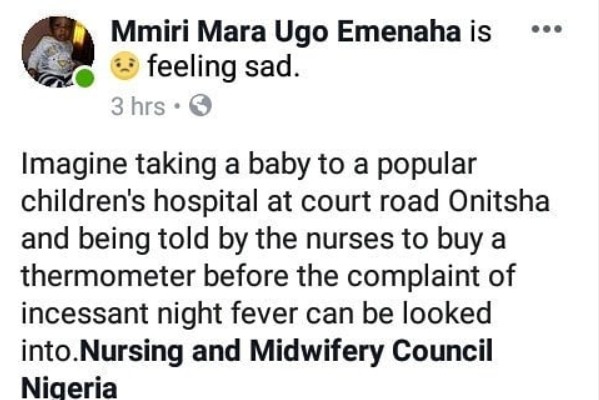 A Nigerian mum has called out nurses at a Children’s hospital in Onitsha, who reportedly told her to buy a thermometer before checking her baby. The sad mum who took to Facebook to share her ordeal, said her baby was down with incessant fever but the nurses at the Children’s hospital in Onitsha allegedly told her to buy a thermometer before checking her.