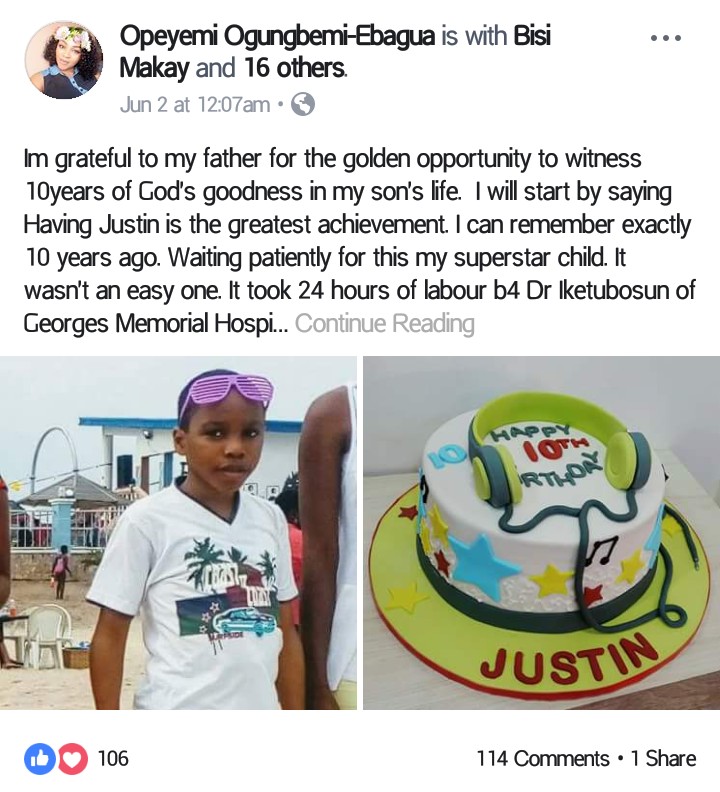 “Im grateful to my father for the golden opportunity to witness 10years of God’s goodness in my son’s life. I will start by saying Having Justin is the greatest achievement. I can remember exactly 10 years ago. Waiting patiently for this my superstar child. It wasn’t an easy one. It took 24 hours of labour b4 Dr Iketubosun of Georges Memorial Hospital decided to cut me open when i wasn’t dilating.