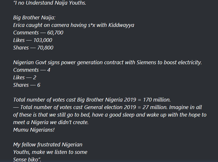 Total number of votes cast General election 2019 = 27 million. Imagine in all of these is that we still go to bed, have a good sleep and wake up with the hope to meet a Nigeria we didn’t create.