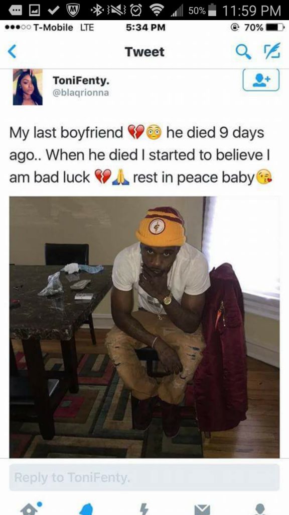 Toni Fenty with the Twitter handle @blaqrionna revealed in separate posts that anytime she breaks up with someone, the person suddenly dies.