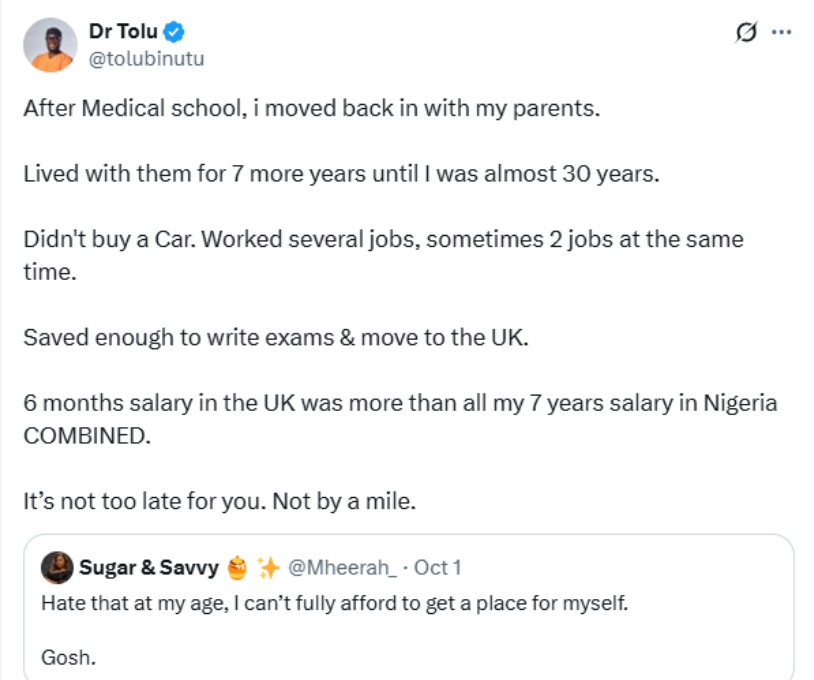 “After Medical school, i moved back in with my parents. Lived with them for 7 more years until I was almost 30 years. Didn’t buy a Car. Worked several jobs, sometimes 2 jobs at the same time. Saved enough to write exams & move to the UK. 6 months salary in the UK was more than all my 7 years salary in Nigeria COMBINED. It’s not too late for you. Not by a mile,” he wrote.