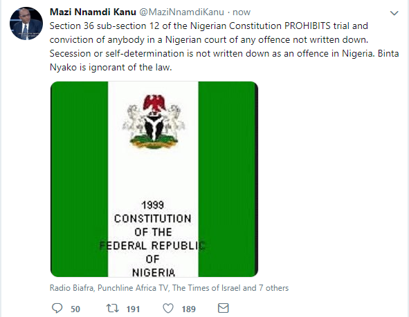 Citing Section 36 sub-section 12 of the Nigerian constitution, he tweeted; “Section 36 sub-section 12 of the Nigerian Constitution PROHIBITS trial and conviction of anybody in a Nigerian court of any offence not written down. Secession or self-determination is not written down as an offence in Nigeria. Binta Nyako is ignorant of the law.