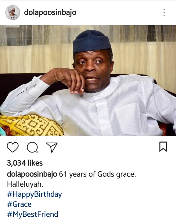 Mrs Dolapo Osinbajo, wife of Vice President, Yemi Osinbajo has taken to Instagram to celebrate her husband on his 61st birthday today .
