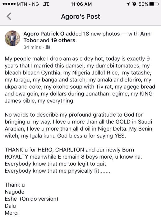 Hian, This one is strong.. And so To celebrate their wedding anniversary a man labeled his wife all the names of food you can imagine, Still filled in the spirit he called her his Benin Witch plus his Money bag..