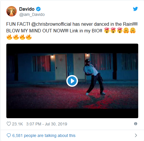 The photos are behind the scene shots from their duet, ‘Blow My Mind’ and according to Davido, the US singer has never danced in the rain before and then he praised him saying, ‘my brother danced in the cold rain for me’.
