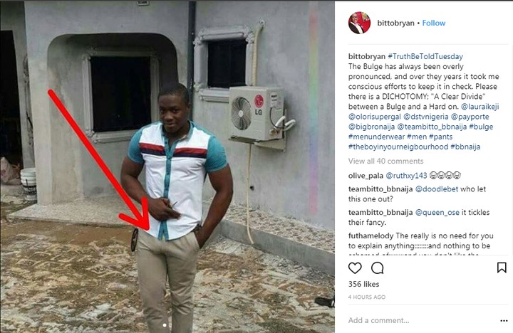 Ex-Big Brother Naija Bitto Bryan who trends online for suffering an embarrassing erection while comforting his fellow female house mate, Nina who was seemingly shedding tears.