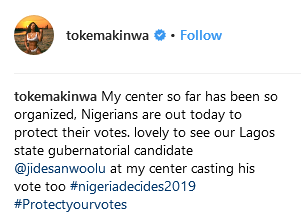 My center so far has been so organized, Nigerians are out today to protect their votes. lovely to see our Lagos state gubernatorial candidate @jidesanwoolu at my center casting his vote too #nigeriadecides2019 #Protectyourvotes