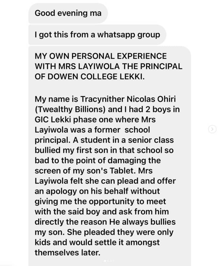 My name is Tracynither Nicolas Ohiri (Twealthy Billions) and I had 2 boys in GIC Lekki phase one where Mrs Layiwola was a former school principal. A student in a senior class bullied my first son in that school so bad to the point of damaging the screen of my son’s Tablet. Mrs Layiwola felt she can plead and offer an apology on his behalf without giving me the opportunity to meet with the said boy and ask from him directly the reason He always bullies my son. She pleaded they were only kids and would settle it amongst themselves later.”