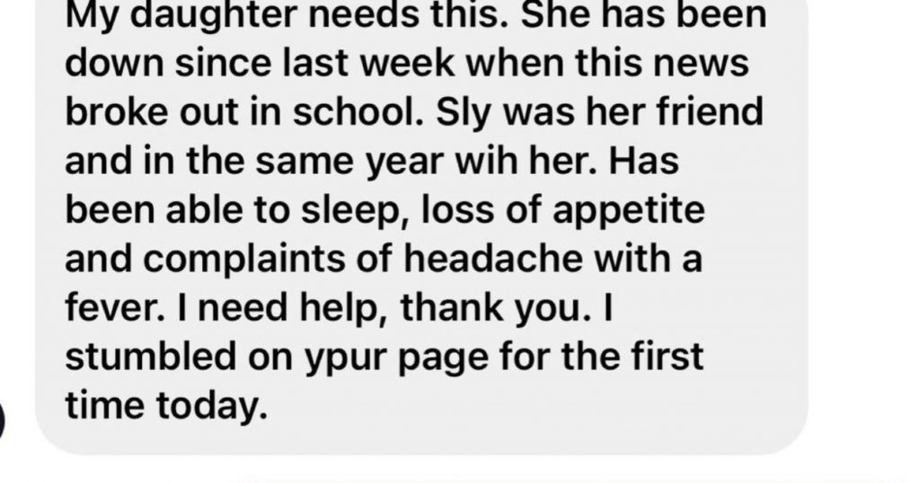 “My daughter needs this. She has been down since last week when this news broke out in school. Sly was her friend and in the same year wih her. Has been able to sleep, loss of appetite and complaints of headache with a fever. I need help, thank you. I stumbled on your page for the first time today.”