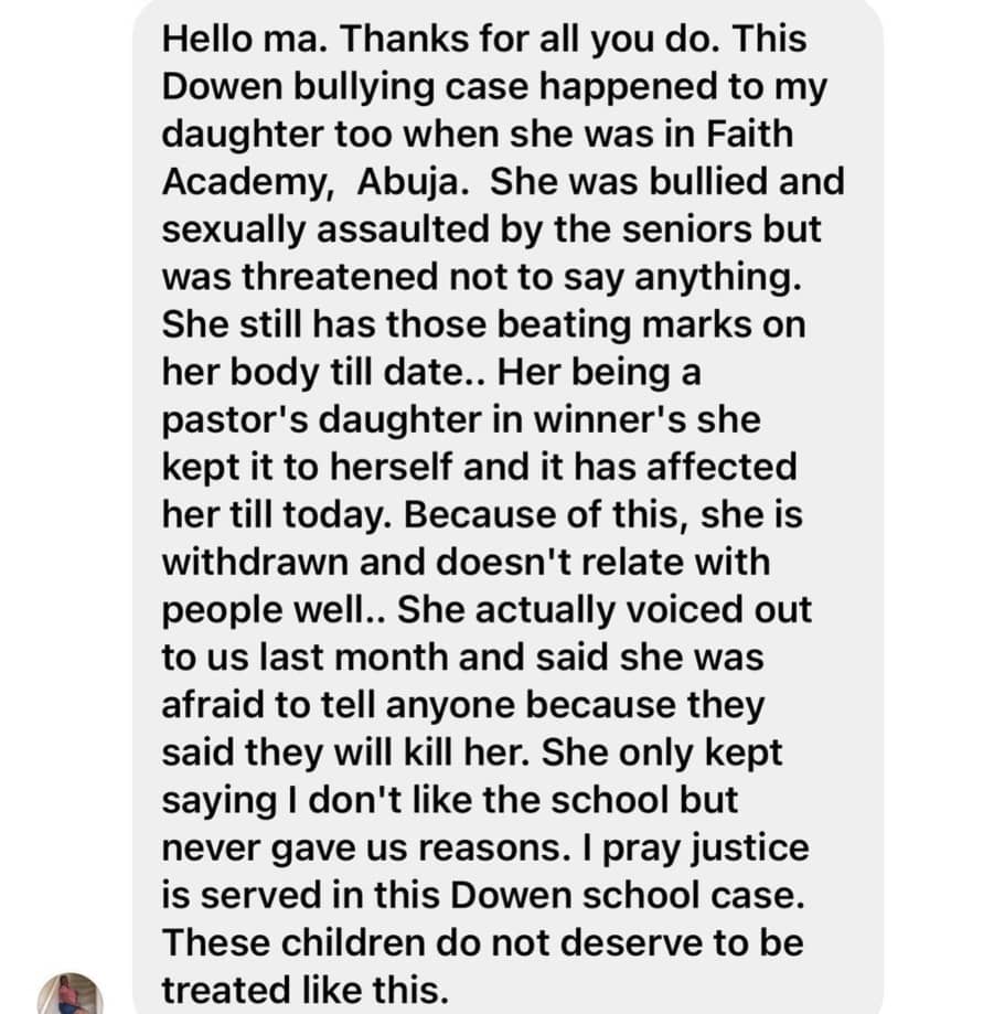 “Hello ma. Thanks for all you do. This Dowen bullying case happened to my daughter too when she was in Faith Academy, Abuja. She was bullied and sexually assaulted by the seniors but was threatened not to say anything. She still has those beating marks on her body till date.. Her being a pastor’s daughter in winner’s she kept it to herself and it has affected her till today. Because of this, she is withdrawn and doesn’t relate with people well.. She actually voiced out to us last month and said she was afraid to tell anyone because they said they will kill her. She only kept saying I don’t like the school but never gave us reasons. I pray justice is served in this Dowen school case. These children do not deserve to be treated like this.”
