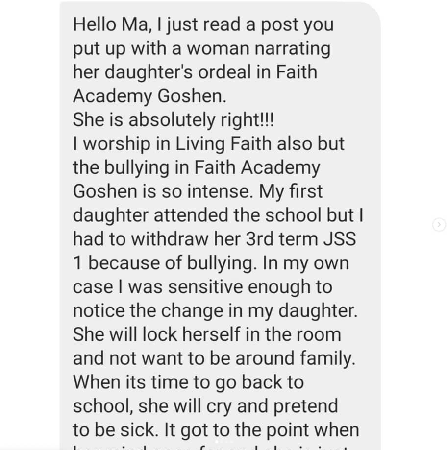 “Hello Ma, I just read a post you put up with a woman narrating her daughter’s ordeal in Faith Academy Goshen. She is absolutely right!!! I worship in Living Faith also but the bullying in Faith Academy Goshen is so intense. My first daughter attended the school but I had to withdraw her 3rd term JSS 1 because of bullying. In my own case I was sensitive enough to notice the change in my daughter. She will lock herself in the room and not want to be around family. When its time to go back to school, she will cry and pretend to be sick. It got to the point when…”