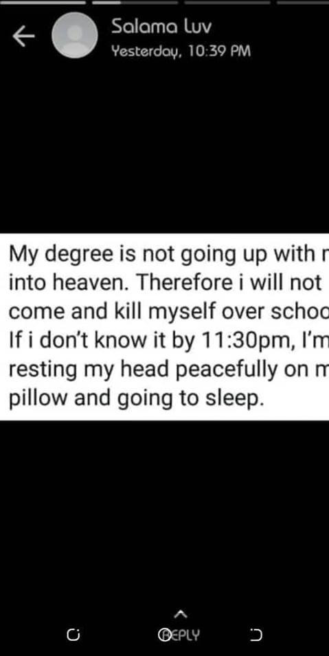 My degree will not go up with me to heaven. Therefore, I will not come and kill myself over school. If I don’t know it by 11.30pm, I am resting my head peacefully on my pillow and going to sleep” she wrote