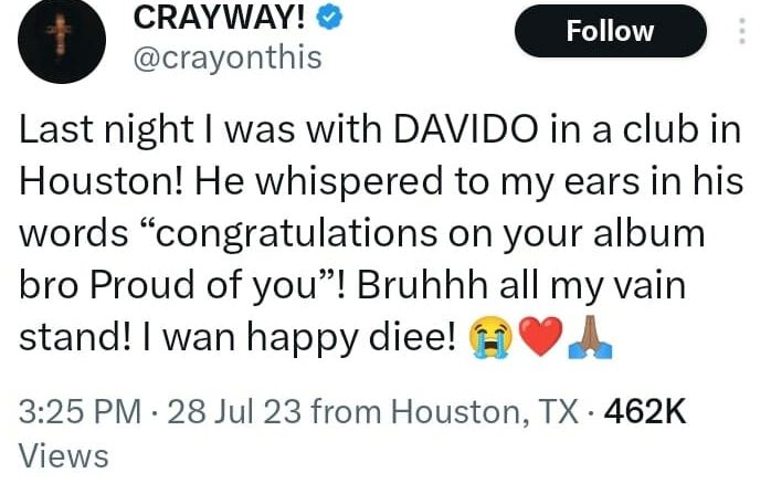 He tweeted: “Last night I was with Davido in a club in Houston! He whispered to my ears in his words “Congratulations on your album bro Proud of you”. Bruhhh all my vain stand! I wan happy diee!!”