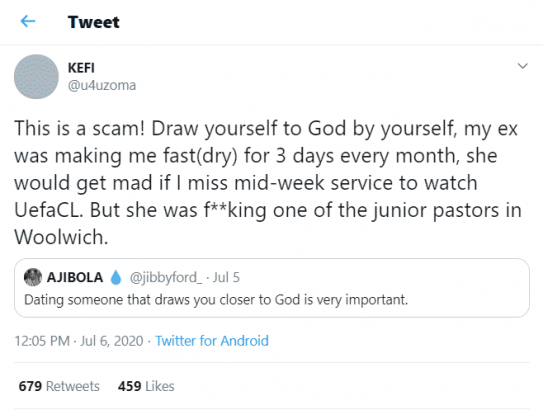 “This is a scam! Draw yourself to God by yourself, my ex was making me fast(dry) for 3 days every month, she would get mad if I miss mid-week service to watch UefaCL. But she was f**king one of the junior pastors in Woolwich.” he tweeted.