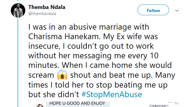 The man identified as Themba Ndala, an entrepreneur wrote on how in-secured his former wife was and and how she always texted him every time he stepped out from home on the suspicion that he was going out with other women.
