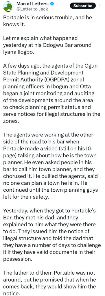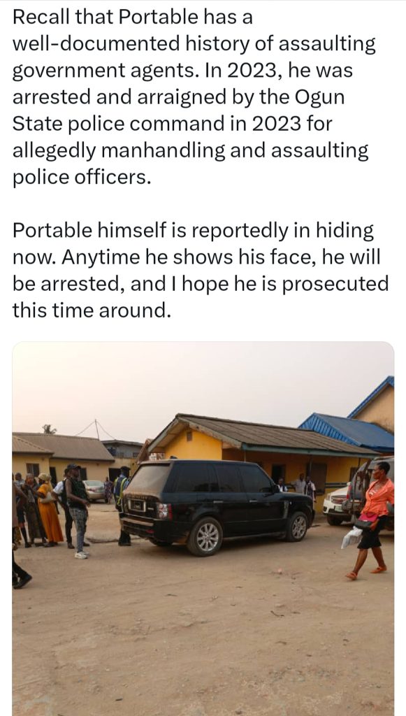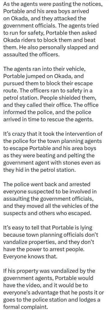 This comes one day after it was reported that the singer went into hiding after allegedly attacking agents of the Ogun State Planning & Development Permit Authority while they were carrying out a joint monitoring and auditing of development around the area where Portable’s bar is located.