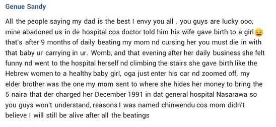 “All the people saying my dad is the best I envy you all, you guys are lucky ooo, mine abadoned us in de hospital cos doctor told him his wife gave birth to a girl that’s after 9 months of daily beating my mom nd cursing her you must die in with that baby you are carrying in your womb, and that evening after her daily business she felt funny and went to the hospital herself nd climbing the stairs she gave birth like the Hebrew women to a healthy baby girl.