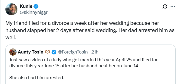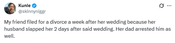“My friend filed for a divorce a week after her wedding because her husband slapped her 2 days after said wedding. Her dad arrested him as well,” he wrote.
