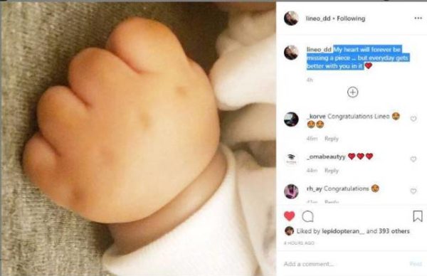 Lineo Didi Kilgrow, wife of musician, Dbanj has taken to her Instagram account to share a picture of their baby’s hand for the first time since he was born. Recall that the couple lost their first son, Daniel Oyebanjo III last year after he drowned in a