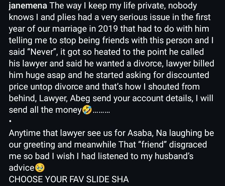 In a recent Instagram post, Janemena shared the reason behind her husband’s decision to seek a divorce during their first year of marriage in 2019