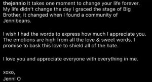 Furthermore, she adds that her “life didn’t change the day I graced the stage of Big Brother, it changed when I found a community of Jennibeans”.