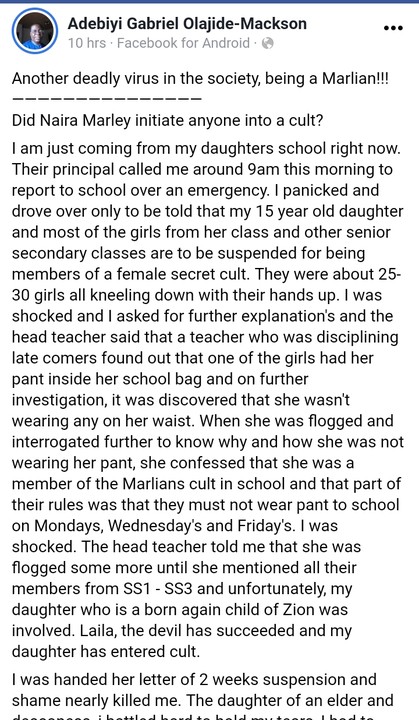 When she was flogged and interrogated further to know why and how she was not wearing her pant, she confessed that she was a member of the Marlians cult in school and that part of their rules was that they must not wear pant to school on Mondays, Wednesday’s and Friday’s. I was shocked. The head teacher told me that she was flogged some more until she mentioned all their members from SS1 – SS3 and unfortunately, my daughter who is a born again child of Zion was involved. Laila, the devil has succeeded and my daughter has entered cult.