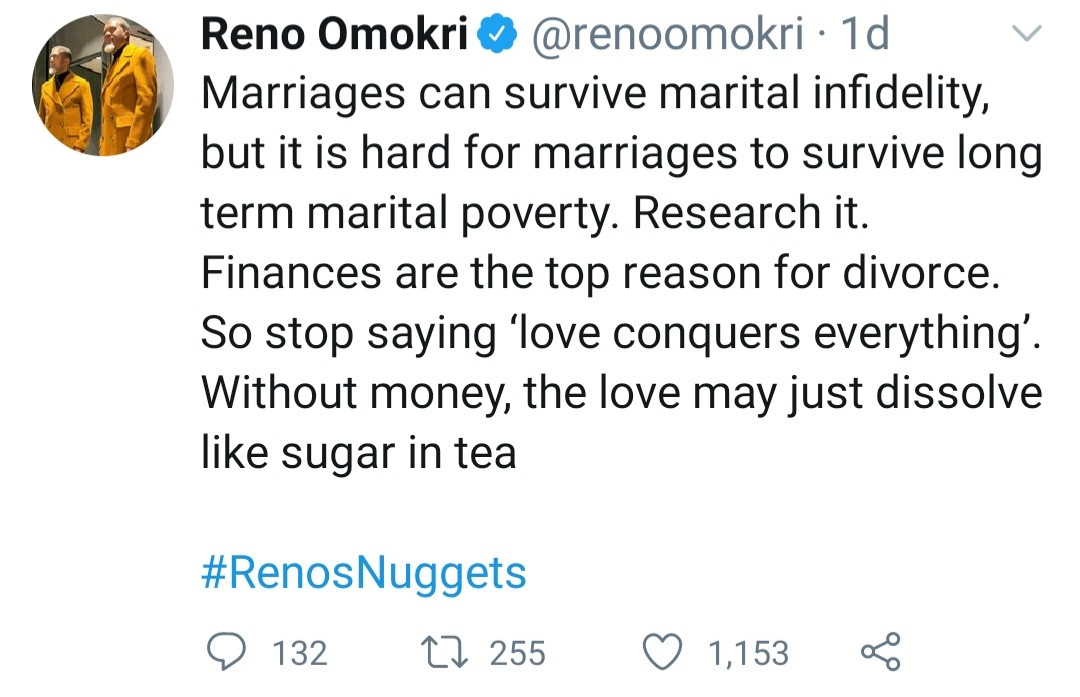 Reality star, Chris Adah has countered claims by ex-presidential aide, Reno Omokri that marriage can survive infidelity but can’t survive poverty.