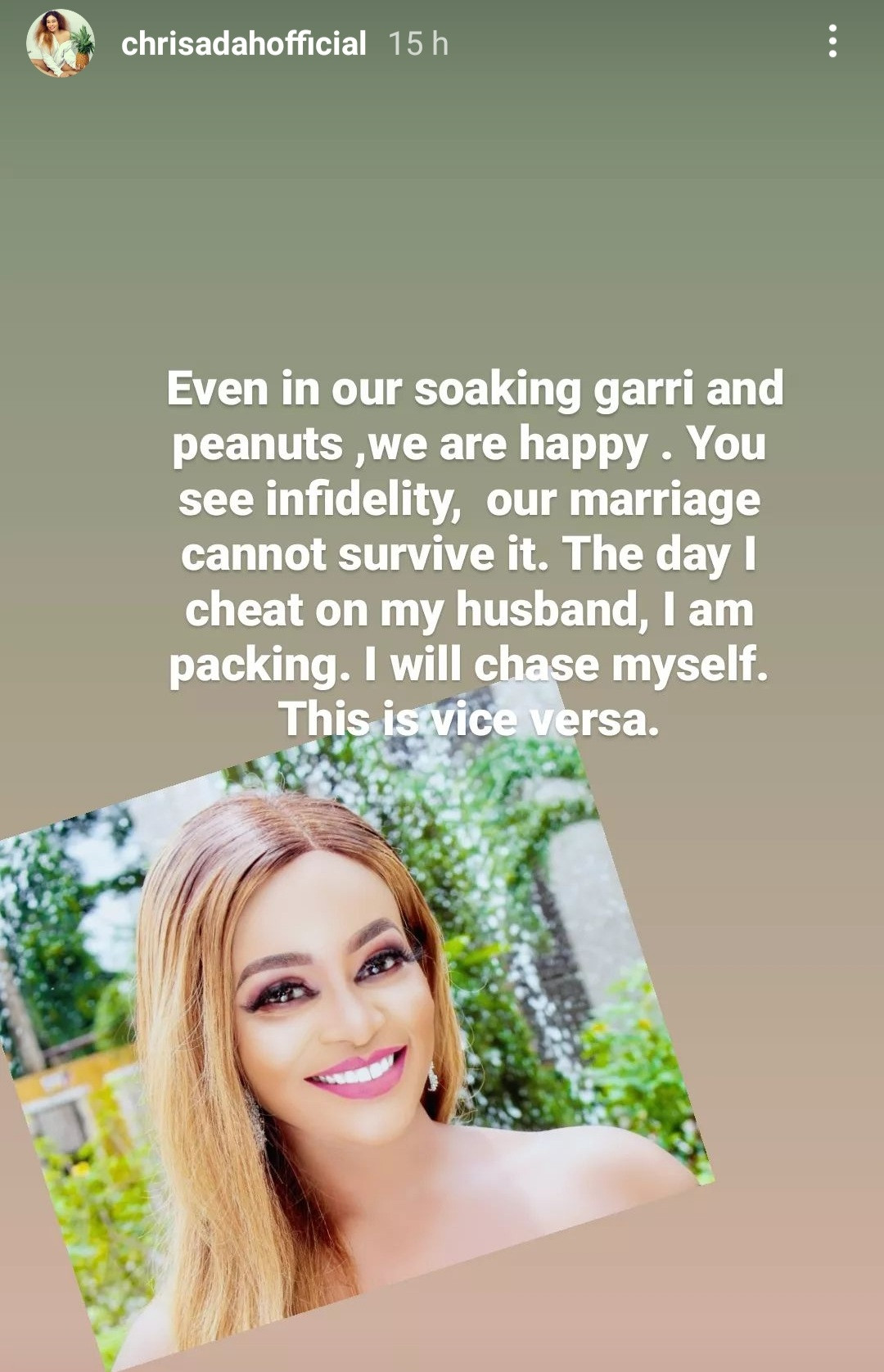 Reacting, Adah said that her marriage has survived poverty but it can’t survive infidelity.