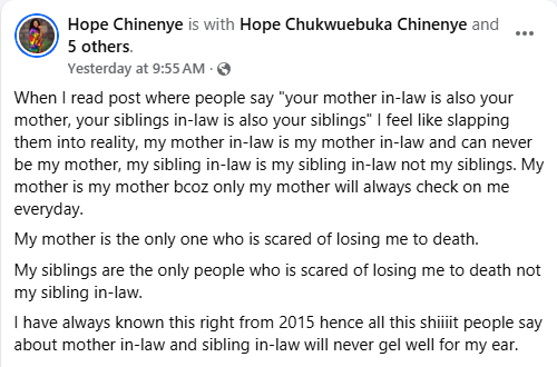A Nigerian woman, Hope Chinenye, has said that she doesn’t consider her mother-in-law as her mother.