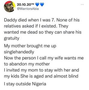 According to a Twitter user identified as @WarriorsAbia who resides outside Nigeria, moving his mother to live under the same roof as his wife has sparked a tussle in his home.