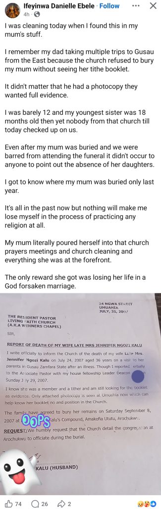 However, their daughter, who was aged 12 at the time of her mother’s passing, said the church refused to officiate her burial without seeing the original booklet showing that she paid tithe to them.
