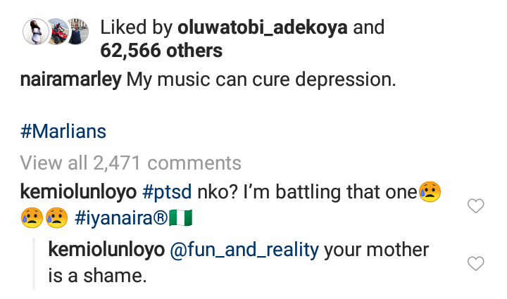 Meanwhile popular controversial journalist who was also suffering from Pstd reacts and blast troll who comes for her at the comment section. Who agrees with Naira Marley on this?? See more below