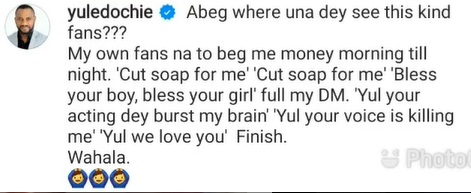Yul wrote; ”Abeg where una dey see this kind fans???My own fans na to beg me money morning till night. ‘Cut soap for me’ ‘Cut soap for me’ ‘Bless your boy, bless your girl’ full my DM. ‘Yul your acting dey burst my brain’ ‘Yul your voice is killing me’ ‘Yul we love you’ Finish.Wahala.”