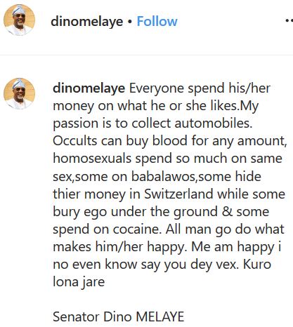 In a post he shared on his Instagram page, Dino said while homosexuals spend so much money on same sex, occults buy blood for any amount, other people hide money in Switzerland, he loves to use his money for his passion which is to collect automobiles.