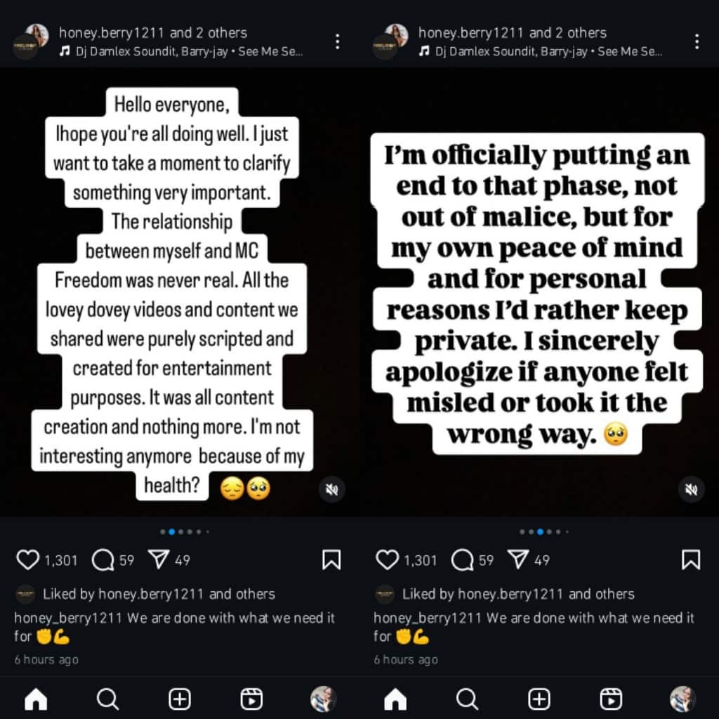 In a heartfelt statement shared via her Instagram page, Honey Berry clarified that the viral romantic content between her and MC Freedom was purely for entertainment purposes and not based on any genuine emotional connection.
