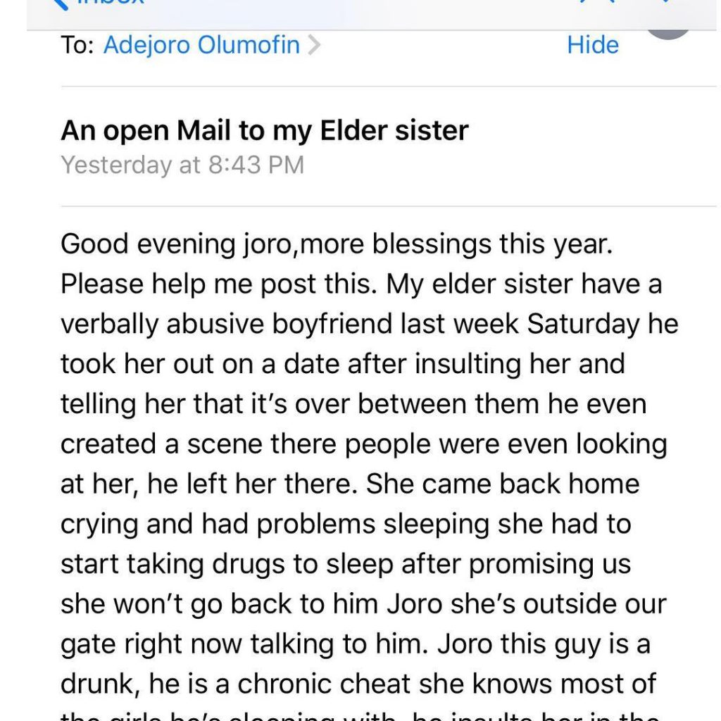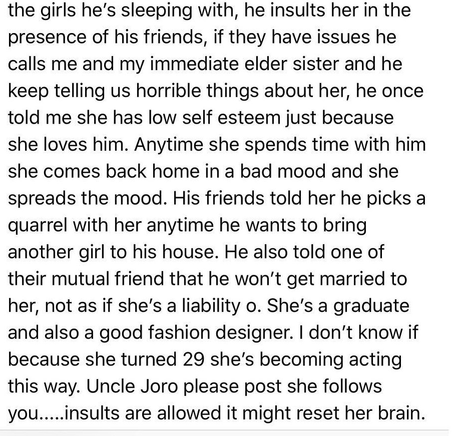 A worried and heart broken man, took to Joro instagram page to share what his sister’s passing through in her relationship that borders him…