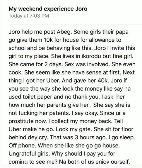 This lady decried the gift of N40,000 given to her by a man she spent some quality time with. According to the man’s account, the lady wanted more cash and this annoyed him. He was forced to collect the funds from the lady, send away the taxi man and leave her with nothing. The gist which was shared with a relatonship blogger, Joro Olumofin has sparked an interesting argument on Instagram. Read his story below: