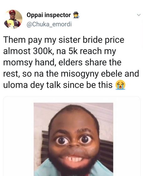“Them pay my sister bride price almost 300k, na 5k reach my momsy hand, elders share the rest, so na the misogyny Ebele and Uloma dey talk since be this.