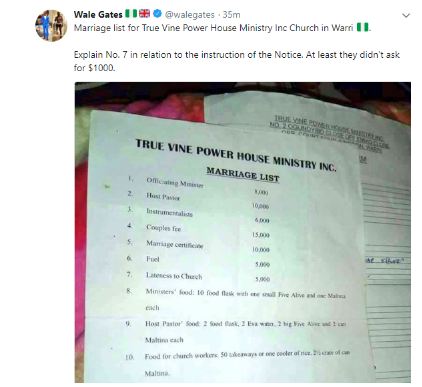 A church in Warri known as the True Vine Power House Ministry Incorporation has released a marriage list for those intending to get wedded in its church. The church also gave a stern warning that all the money should be paid 3 weeks to the marriage.