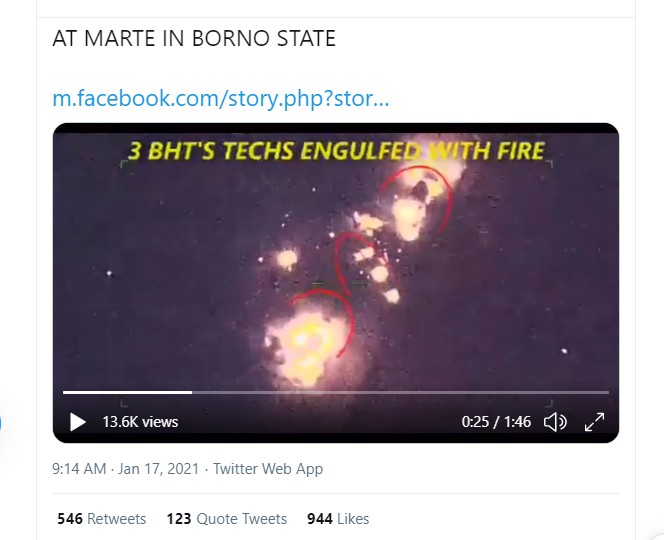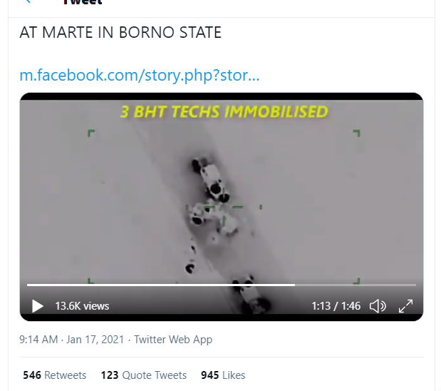 #PressRelease #DHQUpdate OPERATION LAFIYA DOLE: NAF HELICOPTER GUNSHIPS DESTROY 6 ADDITIONAL GUN TRUCKS, NEUTRALIZE SEVERAL TERRORISTS ATTEMPTING REINFORCEMENT AT MARTE IN BORNO STATE https://t.co/TcS6jnxdGK pic.twitter.com/NYHkrQlsOv— DEFENCE HQ NIGERIA (@DefenceInfoNG) January 17, 2021