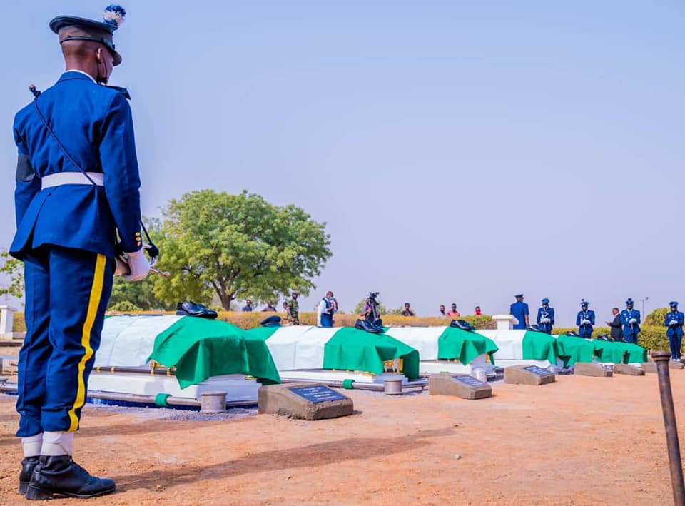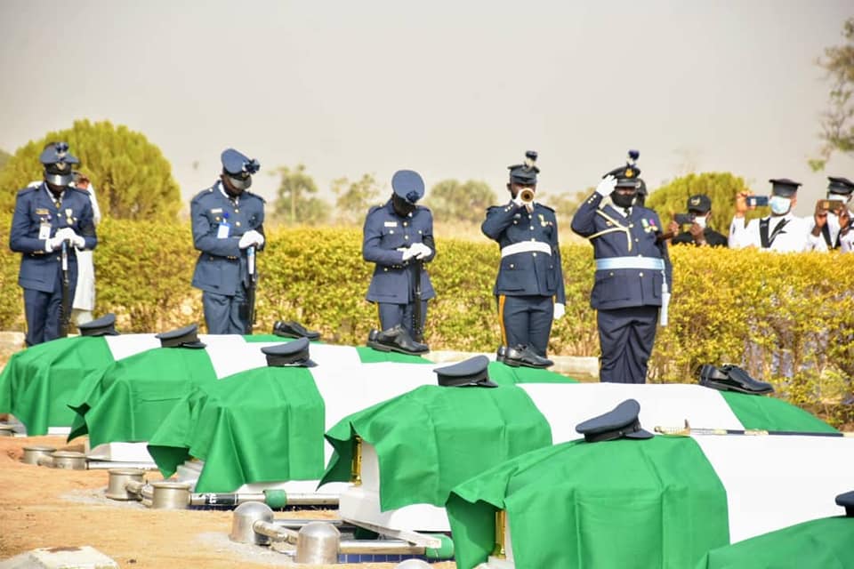 The late gallant personnel were Flight Lieutenant Haruna Gadzama, Flight Lieutenant Henry Piyo, Flying Officer Michael Okpara, Warrant Officer Bassey Etim, Flight Sergeant Olasunkanmi Olawunmi, Sergeant Ugochukwu Oluka and Aircraftman Adewale Johnson. The burial ceremony, which was conducted with full military honours, was held at the National Military Cemetery, Abuja with restricted attendance in compliance with COVID-19 protocols.