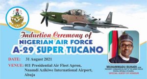 The induction ceremony of the newly acquired A-29 Super Tucano aircraft into the Nigerian Air Force (NAF) Order of Battle is scheduled to take place on Tuesday, 31 August 2021 at the 011 Presidential Air Fleet Apron, Nnamdi Azikiwe International Airport, Abuja by 10.00am.